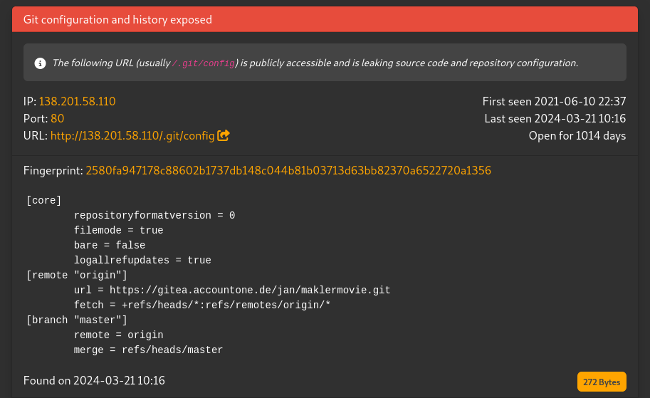 Nach meiner Meldung und einer rechtsgrundlageorientierten Rückfrage hatte ich dem Unternehmen noch einmal geantwortet, mich dann aber längere Zeit nicht weiter mit dem Leck befasst. Erst jetzt fällt mir auf, dass es laut LeakIX zumindest in Teilen noch fast zwei Jahre nach meiner Meldung im Mai 2022 Bestand hatte.