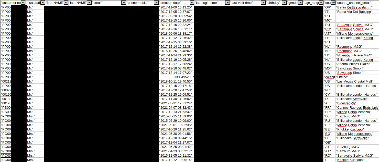 Unter /ftp-demandwareXML/CRM/transaction_address/archive/ befanden sich allein in der Datei transactions_address_20210921.csv fast 800.000 Datensätze mit Namen, Adresse, E-Mail-Adresse, Geschlecht und Telefonnummer. Andere Dateien enthielten auch Geburtsdaten. Es wurden regelmäßig neue Daten geliefert und es gab auch Bilder von Reklamationen zu sehen.